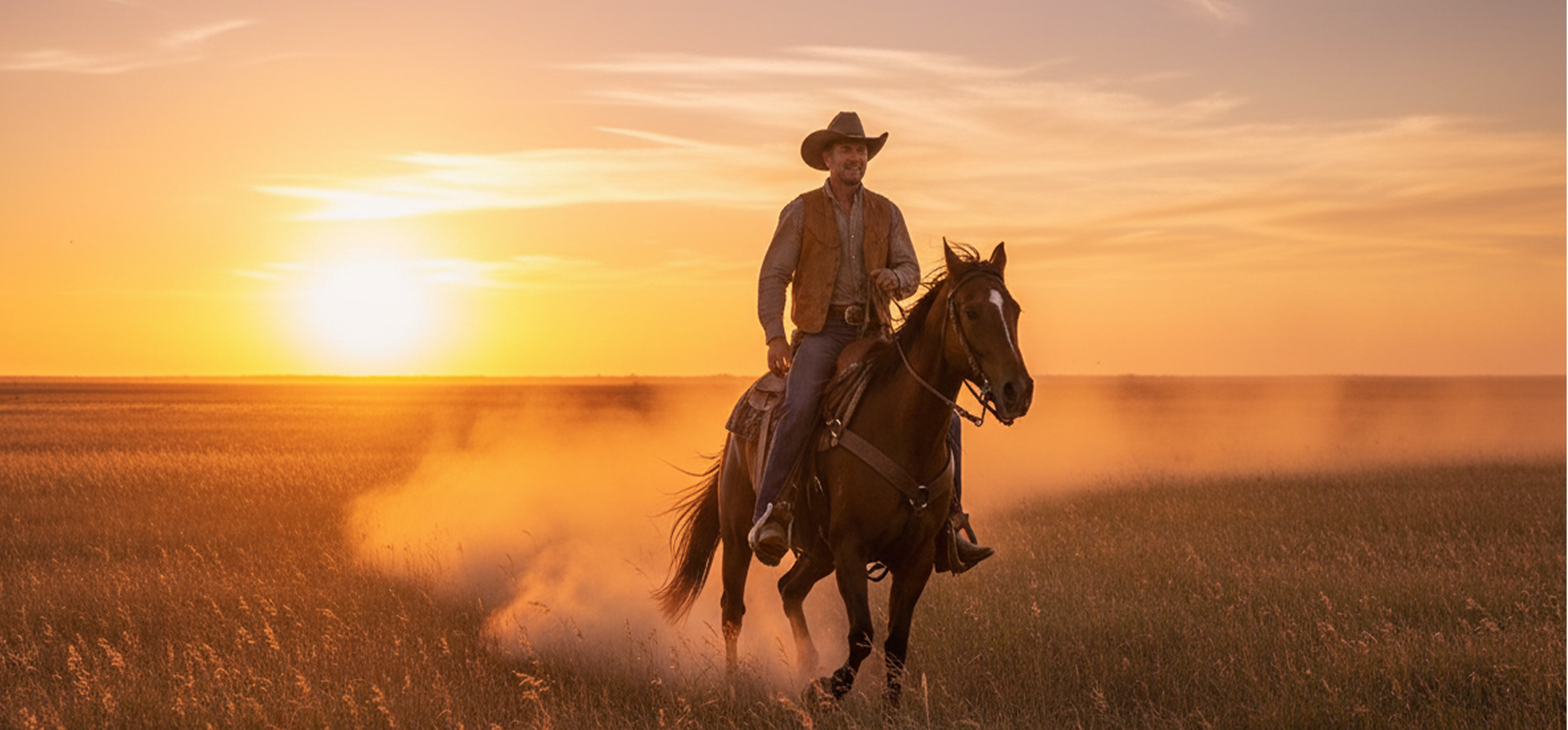 He’s not bound by comfort zones. He’s out where the wild still whispers riding through dawn fog, walking golden fields, or hunting beneath vast skies.